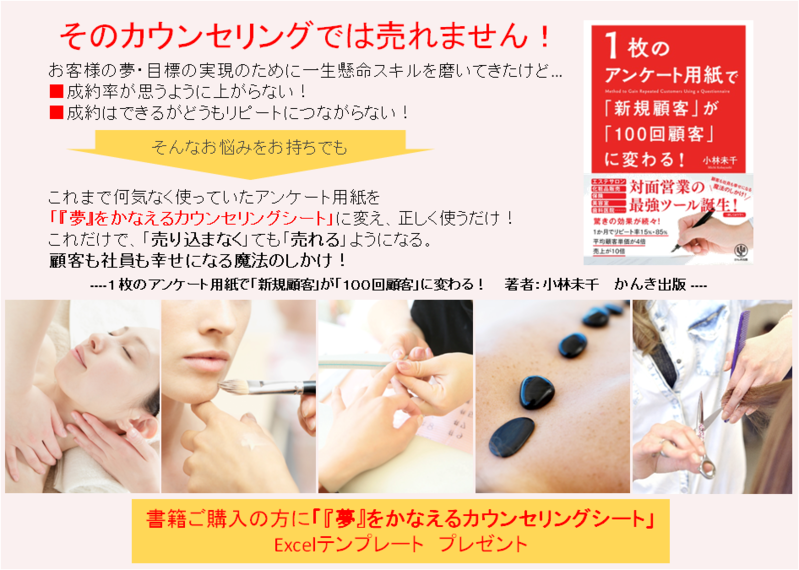 売り込まなくても売れる!「カウンセリング営業」の技術と、そのカウンセリング営業をだれでもかんたんにできるように仕組み化した「『夢』をかなえるカウンセリングシート」が書籍になりました。ぜひチェックしてみた下さいね。